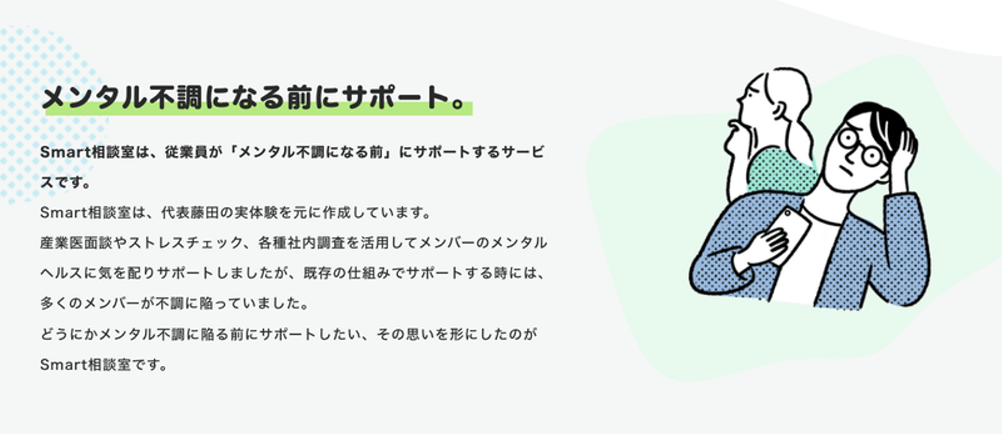 ▲Smart相談室のサービスサイトにも記載されている、「メンタル不調になる前に」という言葉通り、早期に、簡単に相談できる、相談する文化を形成することが働く人のセルフケアリテラシーを上げることにもつながると思っています。