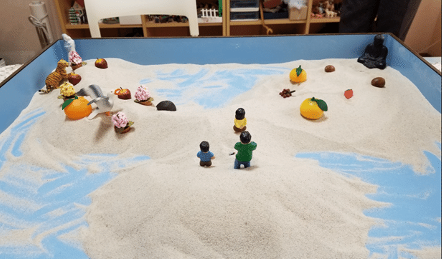 箱庭は箱に入った砂の上に人形を自由に置いていきます。言葉の代わりに人形を置いていくのです。ただただ置きたいところに置きたいものを置く。それだけなのですが、それだけだからこそ自分の考えや深層心理がそのまま出てしまいます。