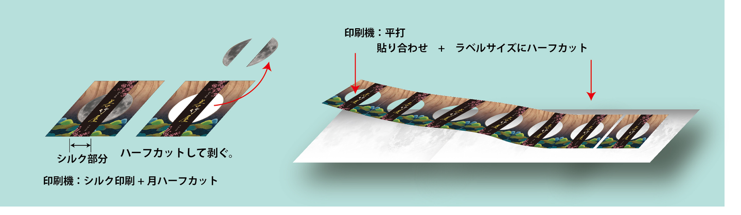 具体的には、木製ラベルと月の模様を印刷した透明素材を貼り合わせる時、あえて位置がずれるように、オフセット間欠印刷機の印刷長さと月のサイズを緻密に計算した上で、木製ラベルを貼り合わせた時に微妙にずれて行くように設計を行った。