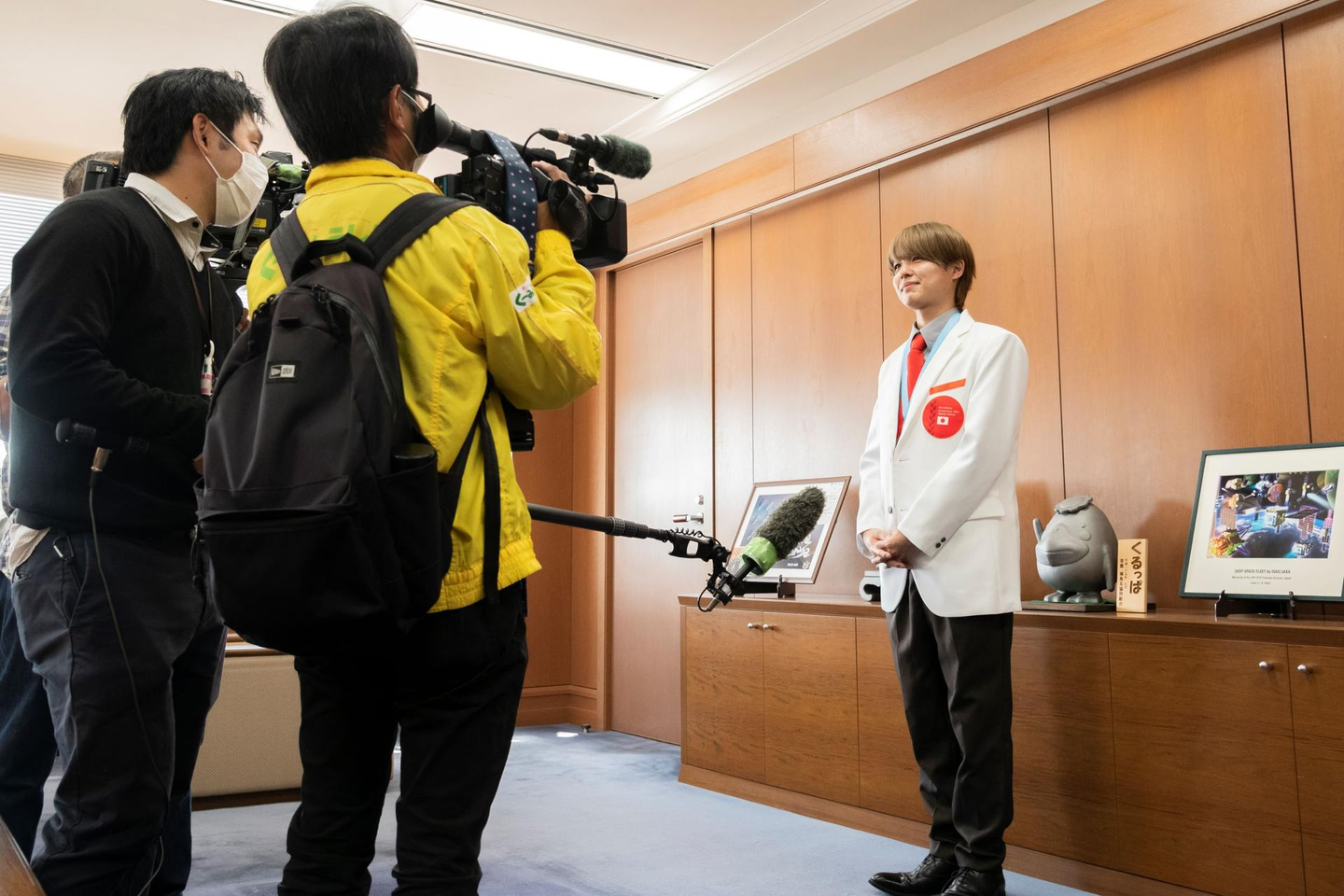 出国前、社内では小規模だが壮行会を開き、 驚かせてリラックスさせようと彼の母校の校長に生徒指導の先生をサプライズゲストとして招待した。思いがけない再会に、応援は社内だけでないことを知るきっかけにもなった。また、壮行会には、新聞社やテレビカメラといったメディア取材も叶った。帰国後も取材は続き、市長への表敬訪問が夕方のニュース番組で放映され、地元紙にも掲載されただけでなく、地域FM局への生出演も果たした。 「取材もかなり慣れて、話せるようになりました」と笑う。