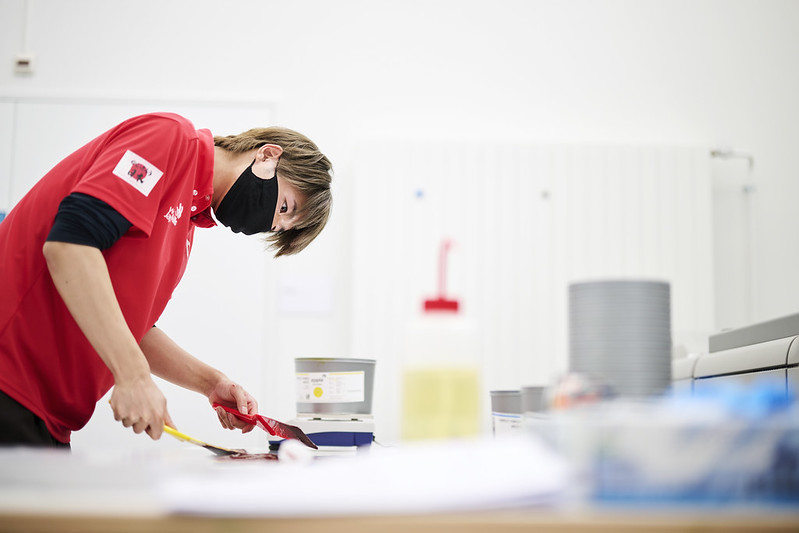 出場権を手にした国際大会だが、当初の開催予定だった2021年中国上海大会はコロナ禍となり中止が決定。気落ちする中、代替措置として、2022年秋に競技毎に開催地を分散しての開催が決定。印刷部門はスイスの都市アーラウが会場となった。 感染状況で、また中止になったりしないだろうか・・・不安もある中、とにかくあきらめずに練習と復習を重ねた。通常業務に練習をプラスした日々は、想像以上に大変だったという。自分だけでなく、他社の指導者の方。先輩の手島。同じ部署で仕事のフォローに回ってくれた仲間たち。「本当に、一人の努力だけではできないことだった。」と振り返る。