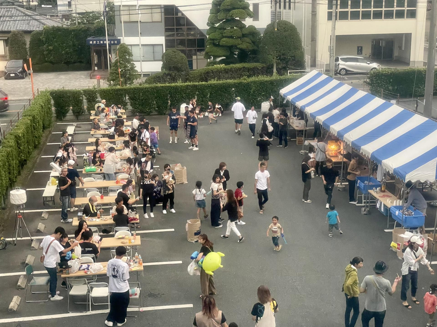 コロナ禍が明け4年ぶりに復活した夏祭り。屋台もイベントもほとんど社員が担当した手作りの社内のお祭り。焼きそば200円、唐揚げ100円、焼き鳥100円、ビール150円の安価なほか、ラムネ早飲み、スイカ割り、端材投げ飛ばしゲーム、そして花火などイベントも充実。すべて自ら企画して実施しています。特に印刷会社の強みを生かした紙製のスイカ割りやシール端材を使ったゲームなどが見どころ。また当社がオフィシャルパートナーを務めるラグビーチーム「ルリーロ福岡」の選手もゲスト登場していただき大盛り上がり。従業員とその家族が参加できるイベントとして多くの方(推定300人)に来ていただきました。
