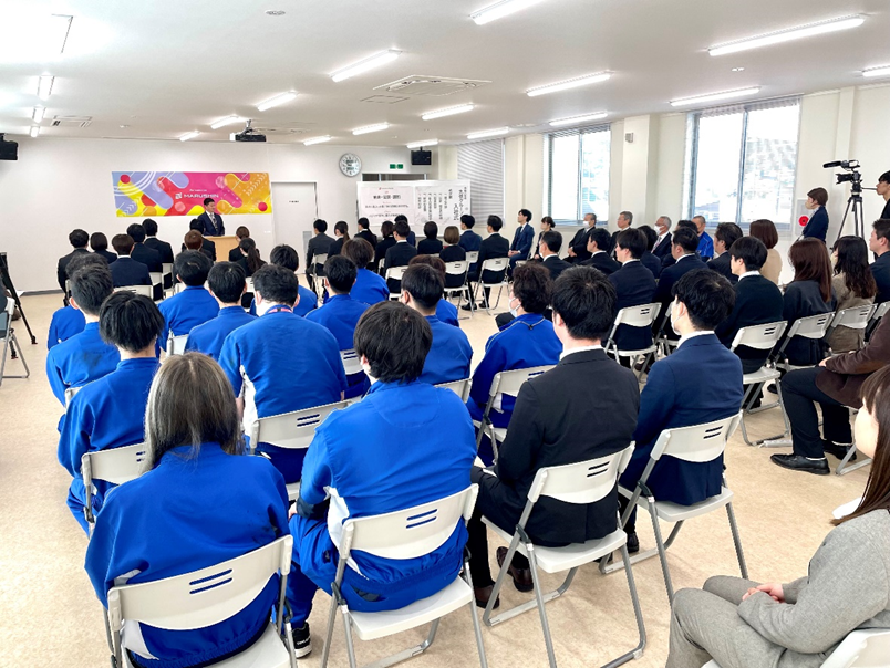 ※新工場(上)と入社式の様子(下)(新卒は前列の20名)