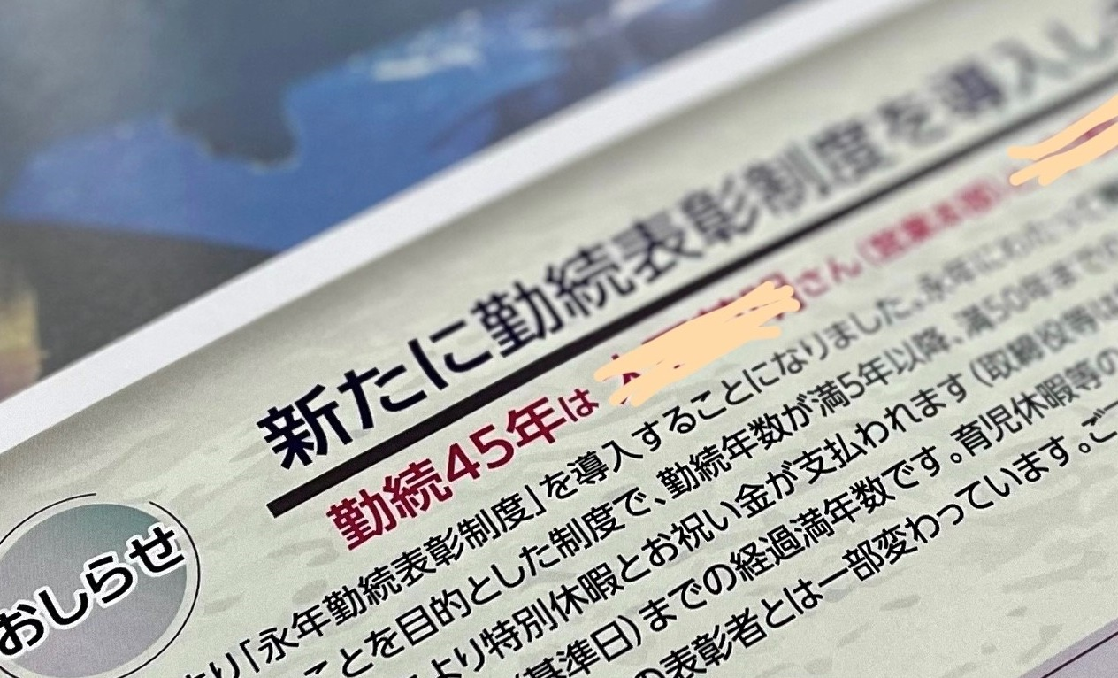 今年度から勤続年数に応じて表彰する制度を導入しました。基本的には5年ごとの表彰となり、最短では5年在籍から対象に。表彰されると特別休暇と報奨金が付与・支給されます。