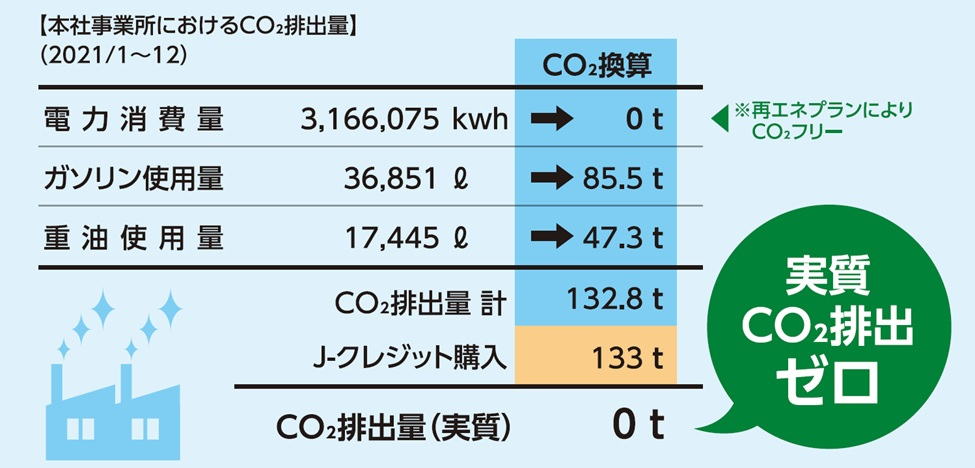 当社は2021年8月に、工場を含む本社事業所でCO2排出量が実質ゼロのカーボンニュートラル(カーボンゼロ)を達成しました。