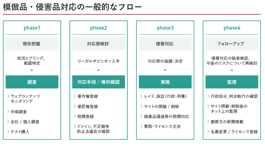 広くブランドイメージを守るために、当社のHPでは、下記のようなフローで一般的な対応を紹介しています。
