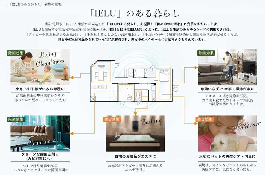 日常生活においても、一般家庭に「蛇口をひねればIELUが出る暮らし」を普及させることができれば、各家庭で諦められていた家庭内感染症のまん延やアトピーなどの外的要因による皮膚疾患などの影響を最小限に抑えることができるのです。