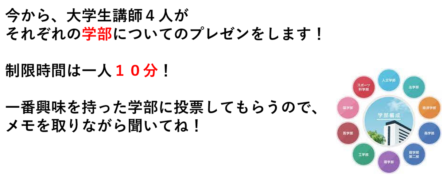 この「学部プレゼン」では、実際にそれぞれの学部で学んでいる大学生講師が、順番に自分の学部の魅力やどんなことを学んでいるかを紹介し、生徒さんにどの学部が一番面白そうだったか、行きたいと思ったかを投票してもらう、という企画になっています。今回は、教育学部、経済学部、薬学部、文学部の4名の大学生講師がプレゼンを行い、薬学部のプレゼンが優勝しました。理系の専門的な実験内容や学問について詳しく説明したところが、多くの生徒さんにとって魅力的に映ったようでした。