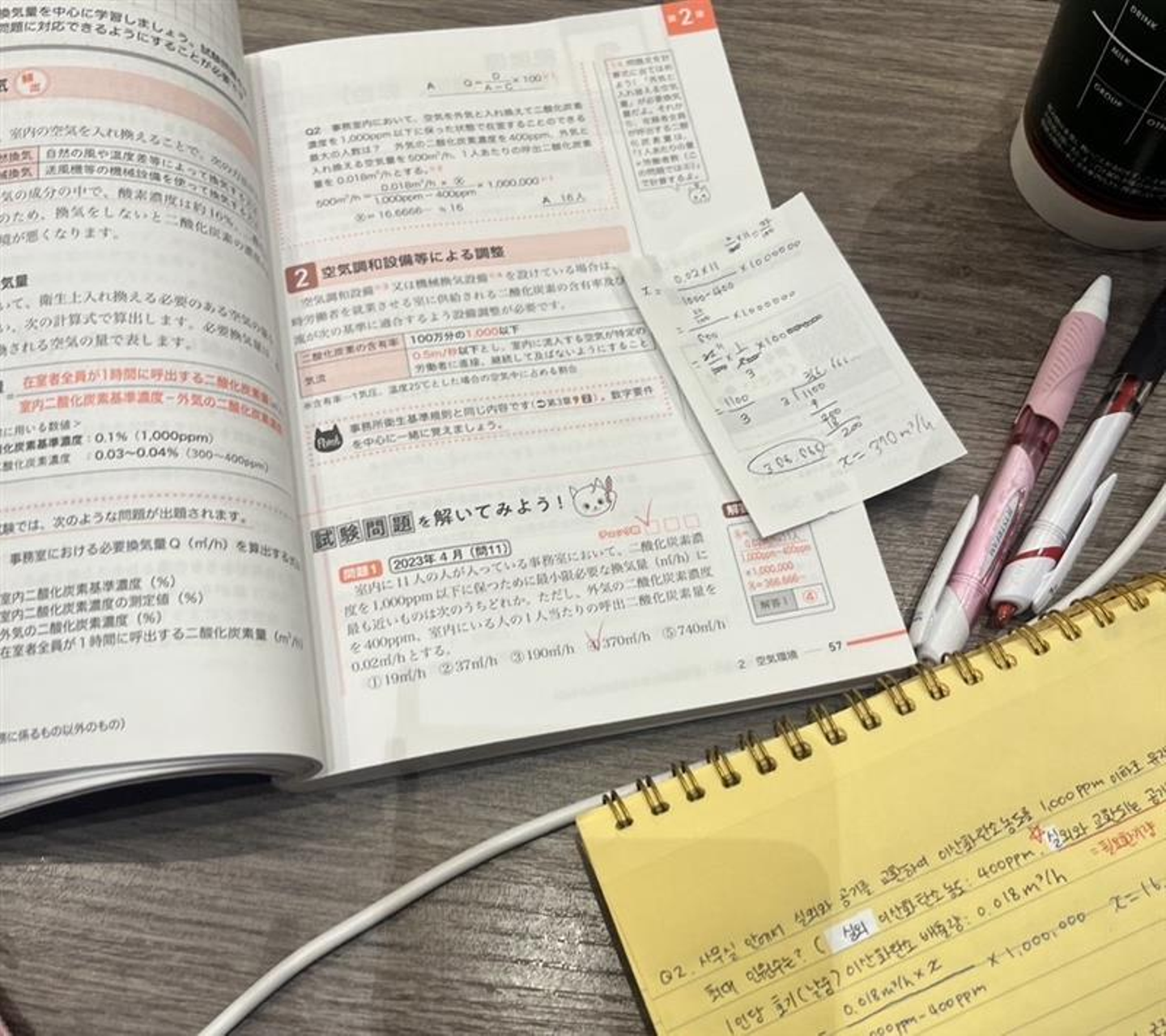 強いて挙げるなら、法律用語そのものよりも、人体に関する日本語表現(心臓など臓器の名前など)の理解に少し時間がかかったと思います。日本語が母語ではないため、最初から日本語だけで完全に理解しようとせず、一度韓国語に置き換えたうえで、自分なりのノートにまとめる方法を取りました。学生時代から、テキストを読むよりも自分の手で書いて整理する方が理解が深まるタイプだったこともあり、日本語の参考書と、自作の韓国語ノートを行き来しながら学習を進めていました。仕事と勉強の両立は、正直に言うと簡単ではありませんでした。
