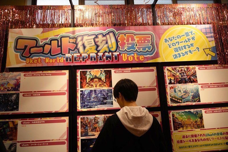 「Vketワールド復刻投票」のコーナーでは、過去に開催された「バーチャルマーケット」の会場の中から、自分が復刻してもらいたいと思う推しワールドの投票が行えるようになっていました。