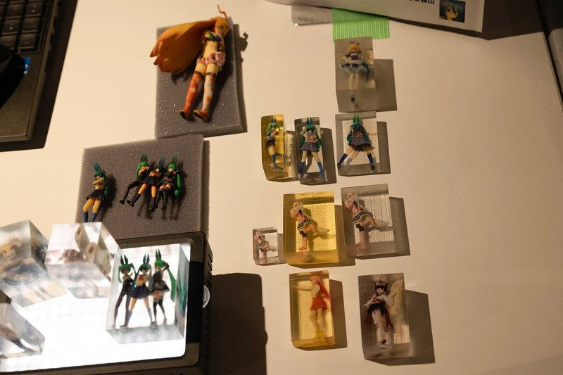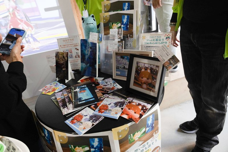 「アバターミーツ」のすぐ隣に出展していたのが、「かえでラボ」のPRブースです。こちらはメタバース空間で撮影した写真などのデータを使ったオリジナルのフォトアイテムが作ることができるというサービスで、透明度が高いアクリルで表面加工された自立スタンド付きの「リルパ」など、サンプルの展示も行われていました。
