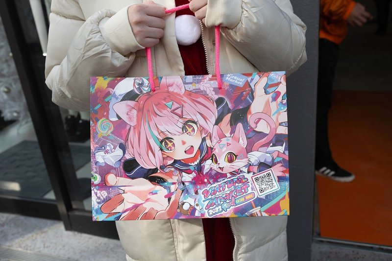 今回の「バーチャルマーケット2023リアルinシブハラ」で、とにかくよく見かけたのが、手提げの紙袋です。会場に近づいたときに、この紙袋を持っている人の後に付いていくと、たいていその場所までナビゲーションしてくれたので、かなり助かりました(笑)。ということで、こちらの「ワーフ原宿」でも、スタッフさんが紙袋を入り口付近で配っていました。
