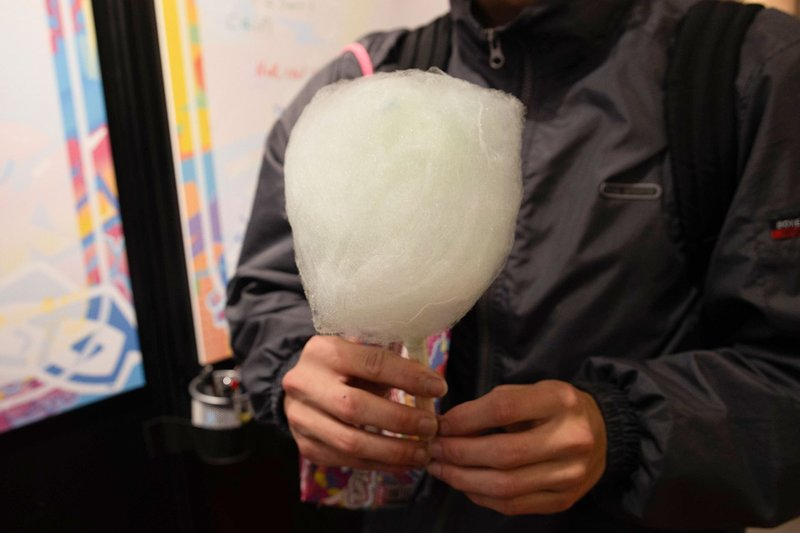 実際にわたあめを持っている人にお願いして撮らせてもらった1枚。よく見ると、グリーンカラーになっています。