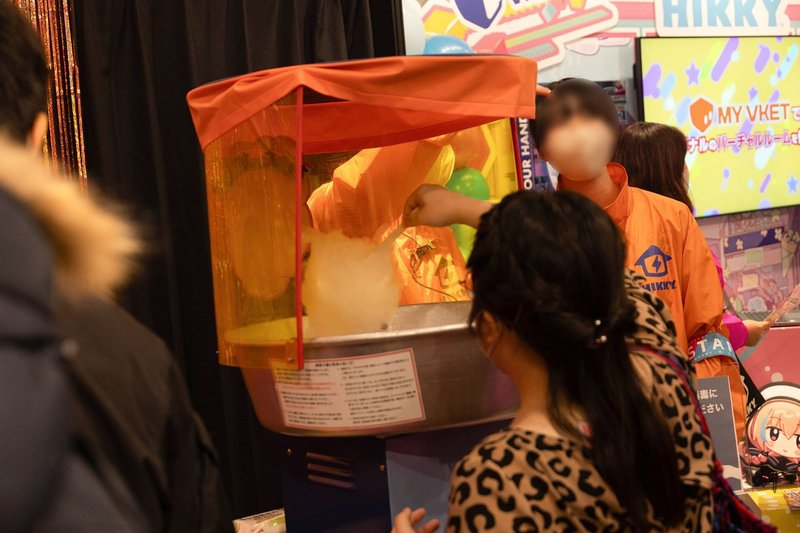 「ヒンメルブラウ原宿」の会場の中でも、人気が集まっていた印象だったのが、メタバースっぽいカラフルなわたあめが無料でもらえる「”改変”推しわたあめ工房!」です。こちらでは、ピンク、ブルー、イエロー、パープル、グリーンの5色の中から推しのカラーを伝えることで、カラフルなわたあめがもらえるというもの。