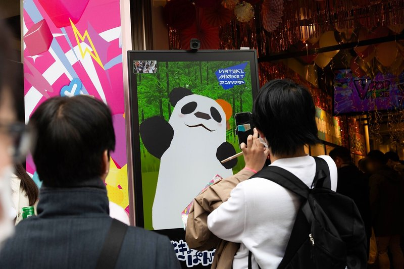 この「ヒンメルブラウ原宿」の入り口近くに設置されていたのが、「ウエルカムメタバース」のコーナーです。なんだろうな? と思って近づいてみると、このときはVTuberの「ききょうぱんだ」さんが縦長の画面に登場しており、来場者とコミュニケーションを取っている様子が見られました。