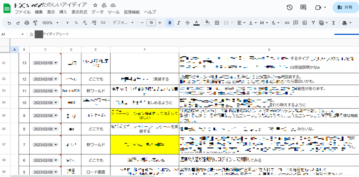 スプレッドシートがびっしり埋まります。アイディア出しが好きな人が多いみたい。