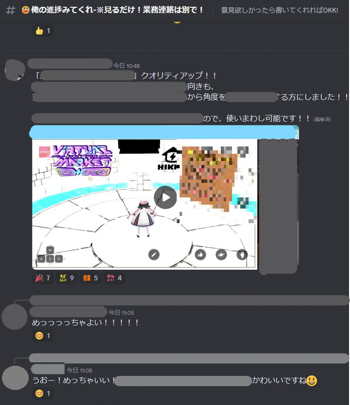 社内チャットに書き込まれるのは、メタバースやECサイトの集客案、漫画やゲームの感想、猫の写真などなど。業務に直結するものに限らず、あらゆる情報が流れてきます。特に、進捗状況を共有するチャットには、画像や動画が頻繁に投稿され、眺めているだけでもワクワクできます。書き込みが起点で新しい企画の議論が始まることもあります。