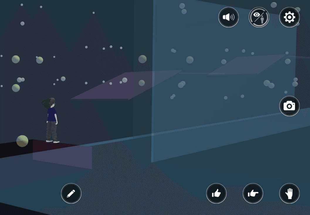 開始地点から、ジャンプを駆使して半透明のブロックを登っていくアスレチックワールドです。賑やかしと奥行きを感じられるよう、黄色い球体をワールドに浮かべています。