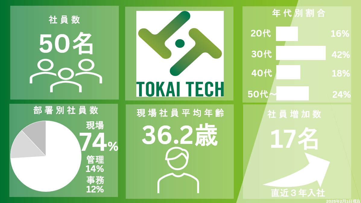 トーカイテックは、各事業所にて現場活躍する社員が中心の会社です。現場の平均年齢は、建設業の中では非常に若く30代であることが特徴です。これは、2024年7月に社長に就任された草太社長が36歳であり、同じ30代の同世代で、これからのトーカイテックを盛り上げていこうという想いに共感する仲間が増えたためです。