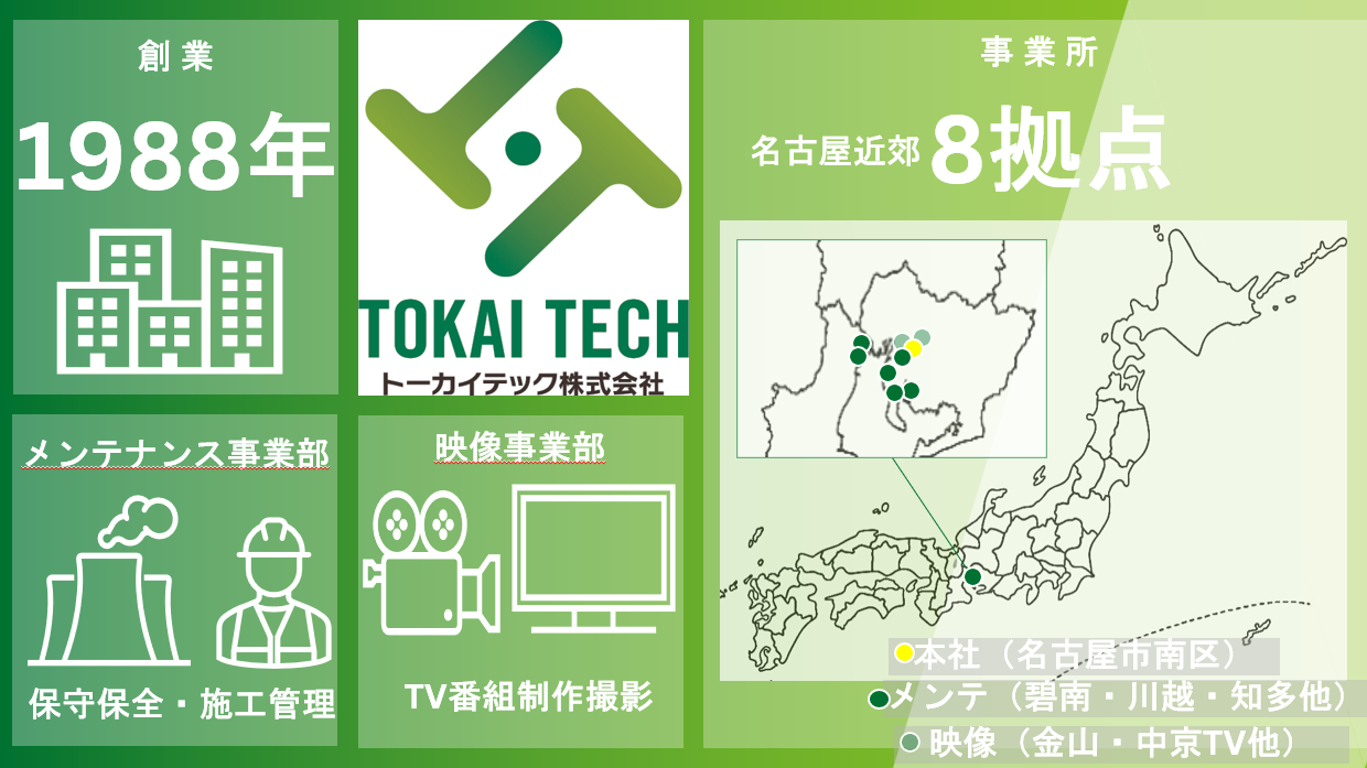 トーカイテックには、発電所の保守保全の施工管理を担うメンテナンス事業部と、テレビ局様の番組制作のお手伝いを担う映像事業部がございます。創業以来、名古屋に根差して営業しております。