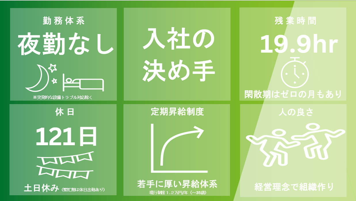 しかし”想い”だけで入社を決めたわけではありません。ちゃんと生活面の安定や家族との時間のことを考えて、転勤や残業が少ない点なども考慮しました。事業所見学した際に、同世代の人が多くいたことで安心感があったり、ホームページを見て家族のことを考えてくれる会社だという印象もあり、配偶者からも応援してもらえたことも、入社の決め手になりました。