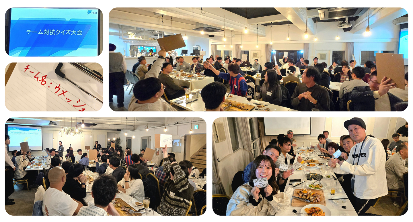 初日の夜は全員での懇親会。愛媛県やエフネットにちなんだクイズ大会で盛り上がりました!優勝チームには豪華景品も用意されるなど、ゲームを企画してくれたJAM(ジュニアアシスタントマネージャー)の皆さんには感謝です★☆
