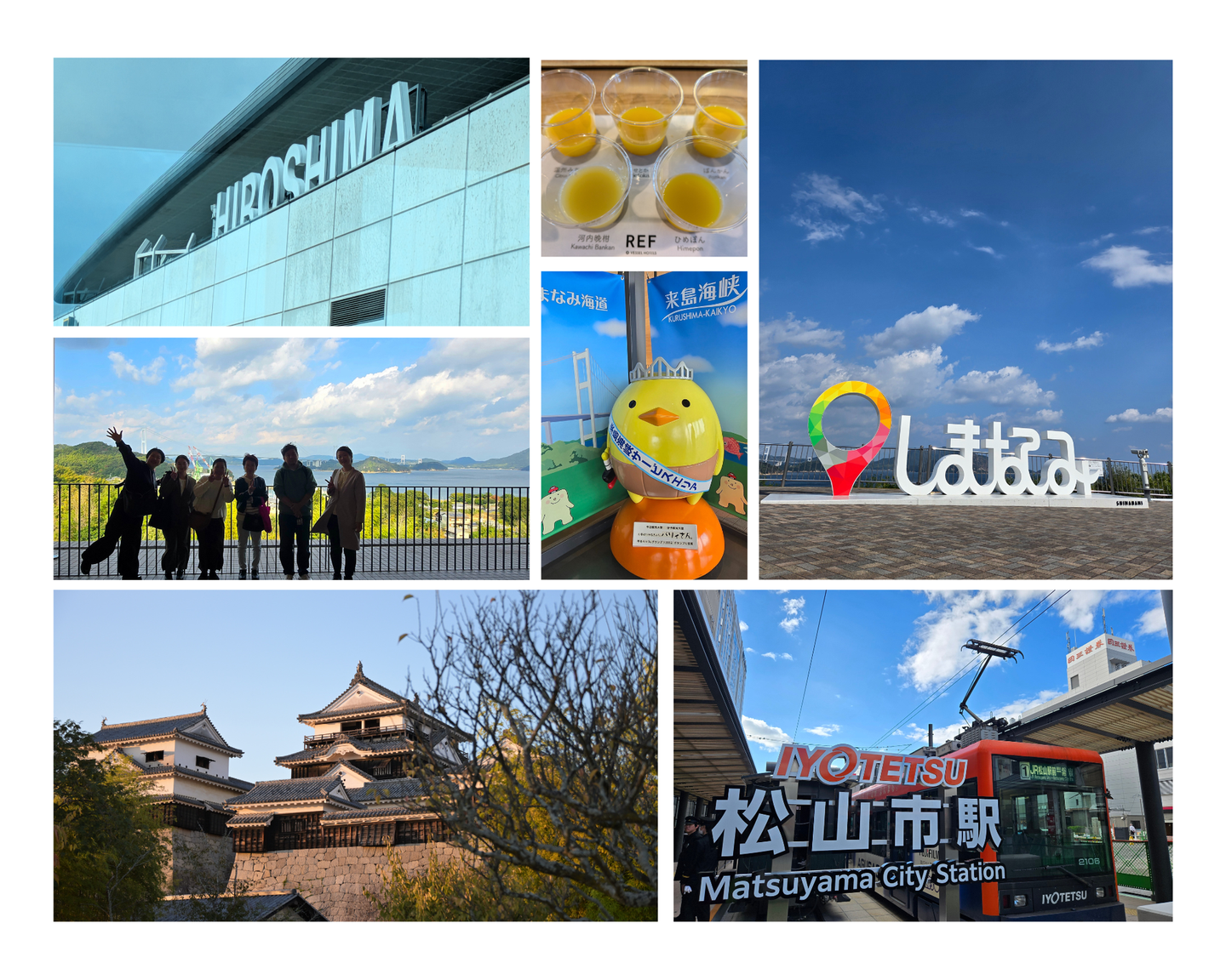 羽田を出発し、まず到着したのは広島空港。しまなみ海道をバスで南下し瀬戸内海の景色を見ながら愛媛県松山市に入りました。これから3日間、松山市駅近くのホテルに滞在します。