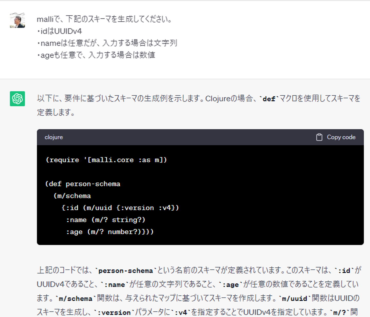 Clojureでも回答はしてくれますが、若干の間違いを含んでしまうのに対し、laravelのスキーマは完璧です。開発者の量という相対的な意味でLLMを使った開発体験を享受しづらい点は、私たちが手放したトレードオフを分かりやすく表してくれます。