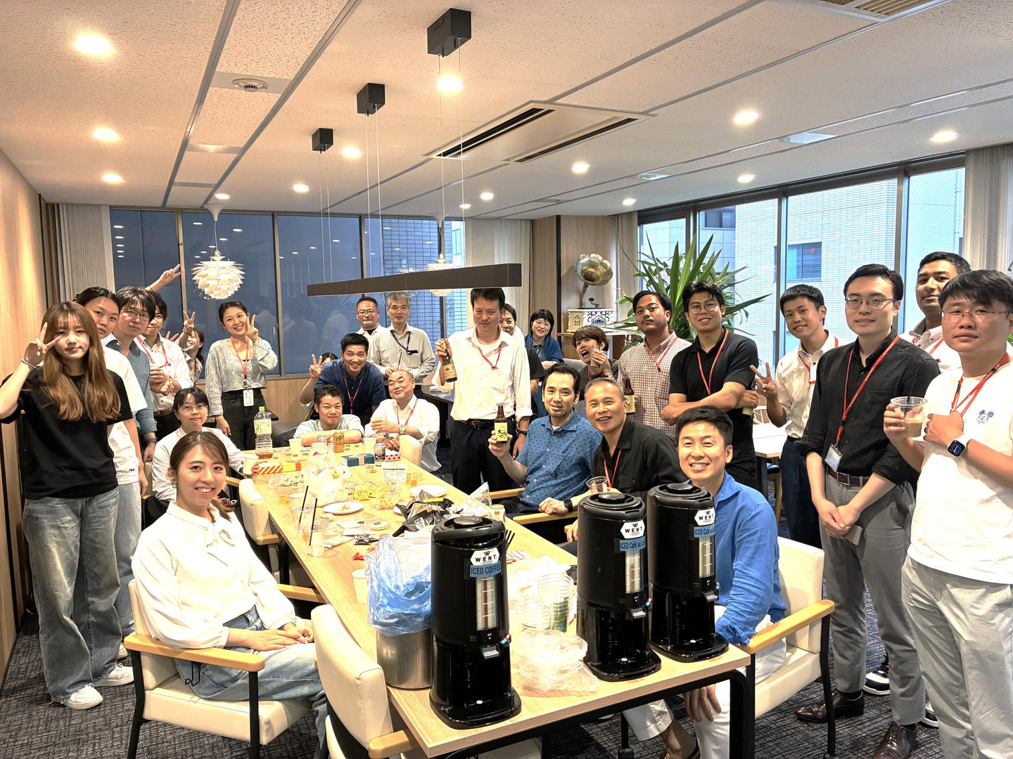 ケーキから軽食ビュッフェ形式になり、もはや1つの会議室には人数が入りきらないため昨年移転した新しいオフィスの共用スペースへ全員大集合です。