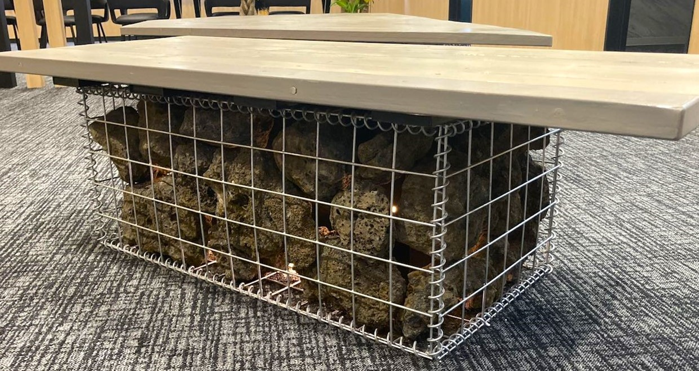待合ベンチの形は当社のロゴを連想する形で、下部分の材質はなんと本物の溶岩!!