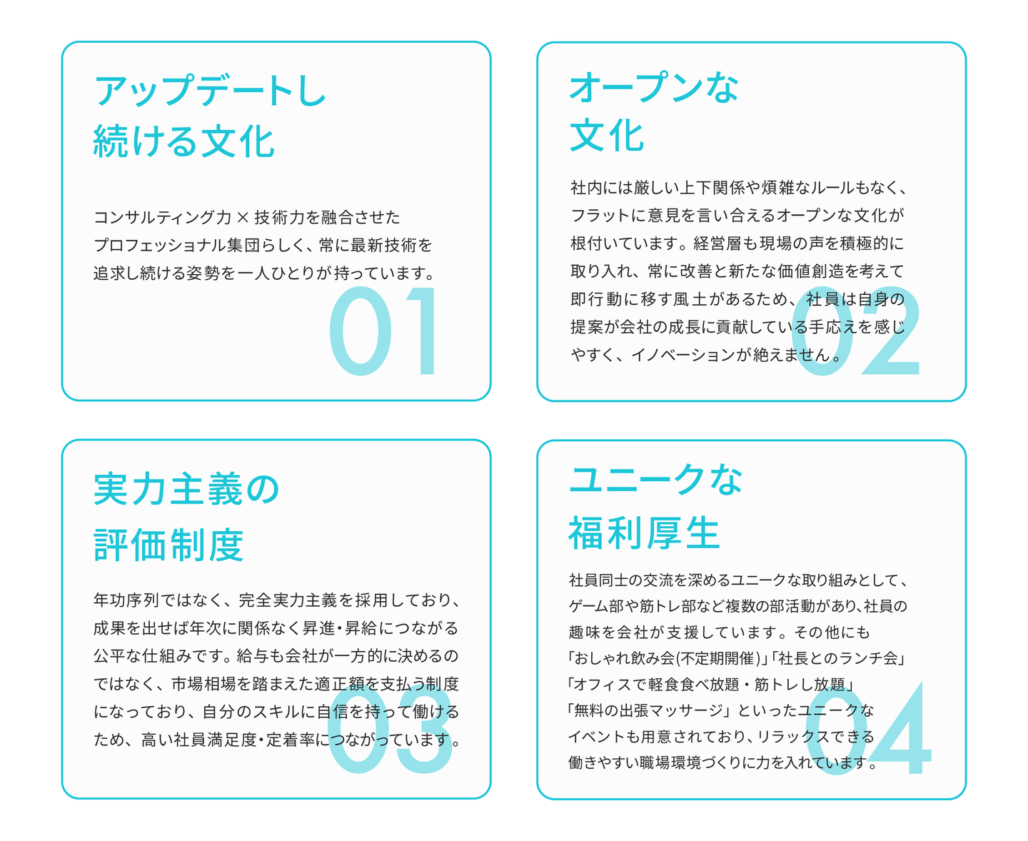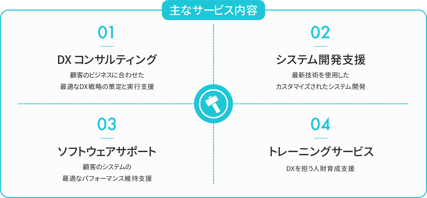 圧倒的なエンジニアリング技術を持ち、国内トップレベルのDX支援実績を誇る当社。 AIやRPA、LCAP(ローコード開発)などの新しいソリューションをいち早く取り入れ、他社が諦めるような困難な課題にも果敢に挑戦し、必ず解決します。