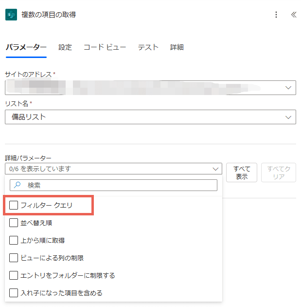 - Power AutomateのフローにSharePointの複数の項目の取得アクションを追加し、リストを指定します。