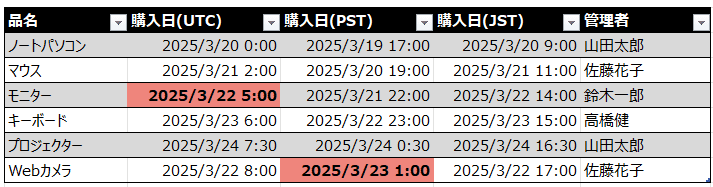 上記をまとめると、リストのアイテムの購入日列の日時は、タイムゾーンによって以下の表のようになります。