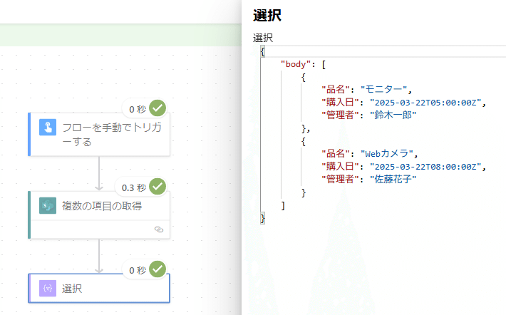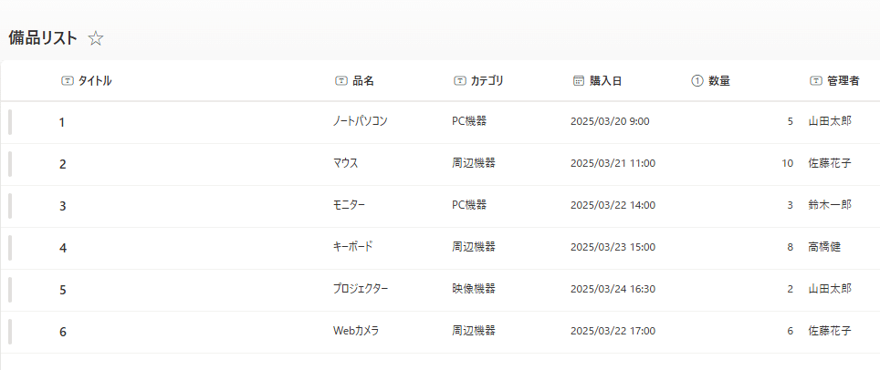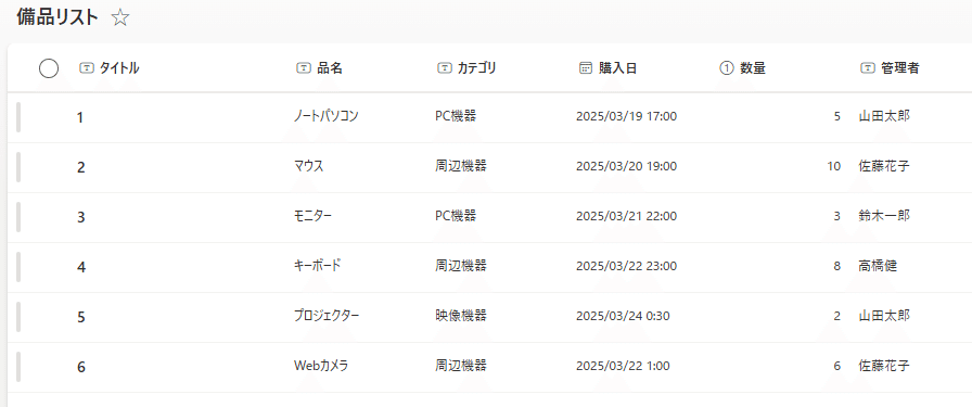 今回は例として、テスト用に作成した備品リストから、購入日が2025年3月22日のアイテムを取得してみます。