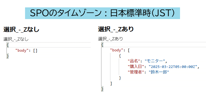 Zなしの場合、SPOのタイムゾーン設定に従い、JSTの 2025/03/22 00:00~06:00のデータを検索しています。しかし、その条件に該当する結果がないため、空の配列が返されています。