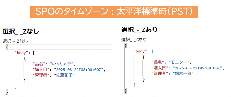 しかし、SPOのフィルタークエリで指定した日時は、タイムゾーンが明示されていない場合、SPOのタイムゾーン(デフォルトではPST)に基づいて解釈されるため、注意が必要です。