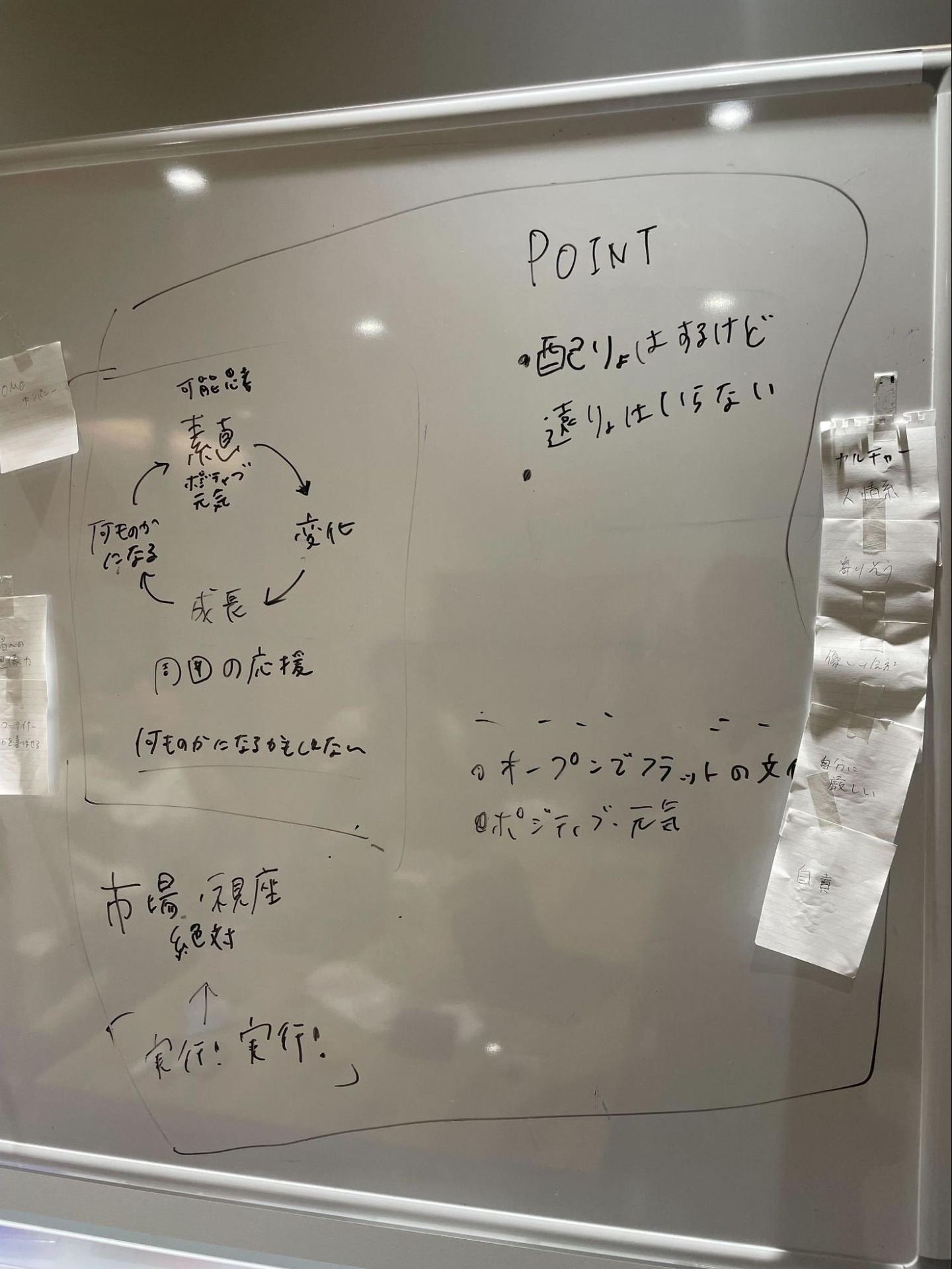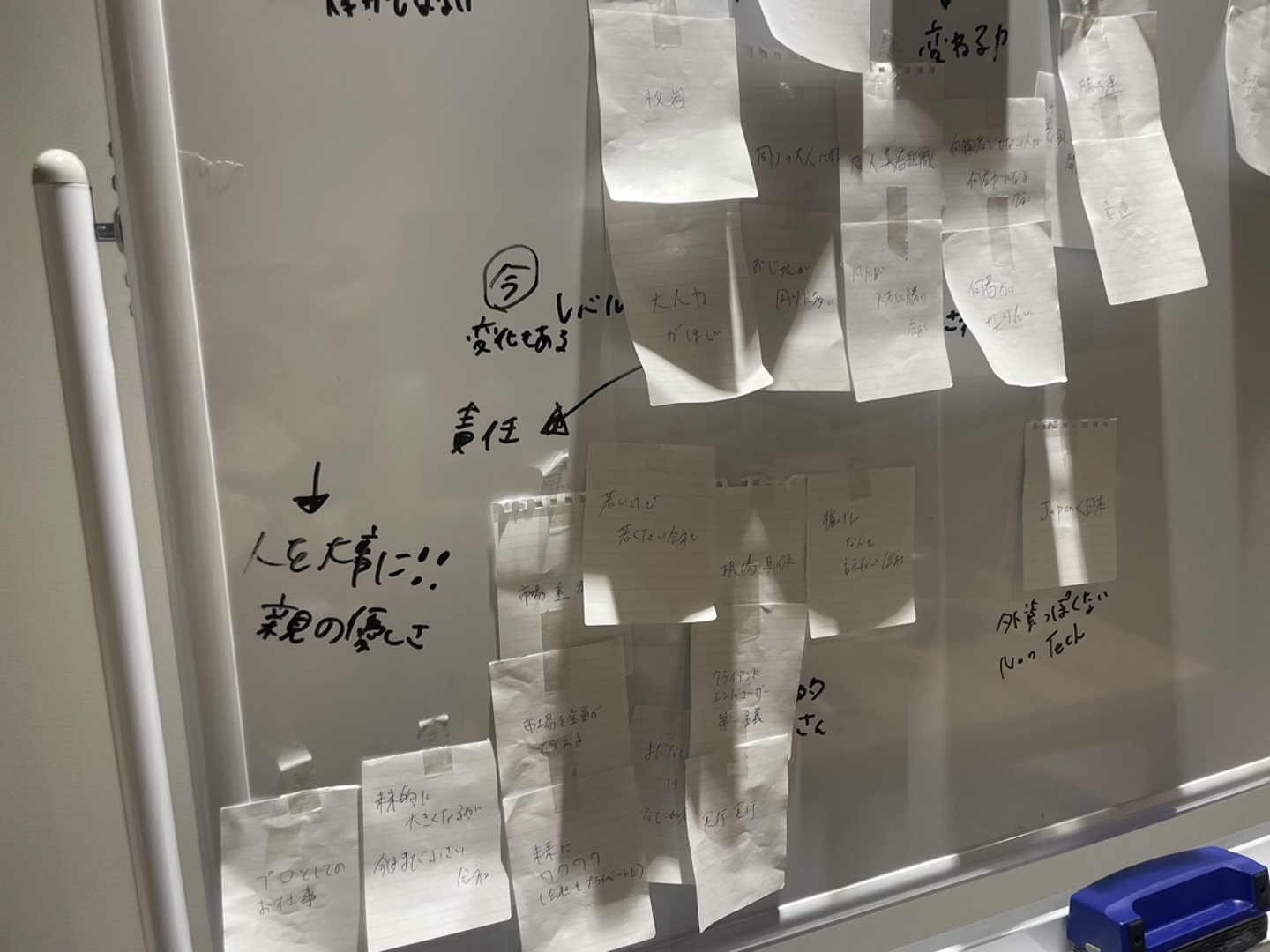 1人ずつカードをホワイトボードに貼りながら、なぜこの要素を出したのか、どういう意味なのかを説明していきます。経営メンバー間で同じ内容のものもあれば、話してみると解釈がまとまることもありました。