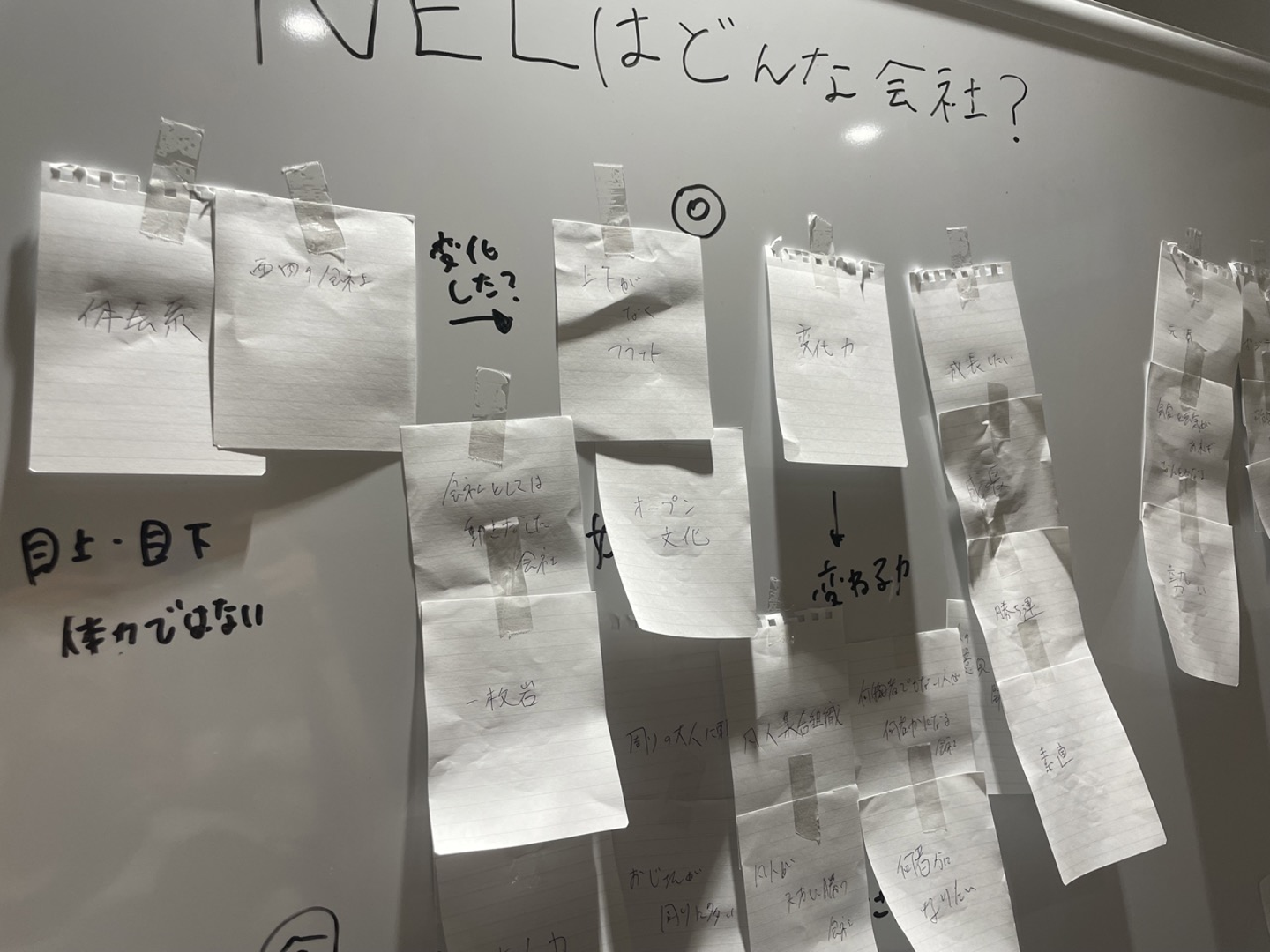 ディスカッションのワークとして、それぞれから見て「NELはどんな会社?」という問いに対して、時間を決め、思いついた要素を全部出します。10分前後で全員で50枚程度の要素が出てきました。