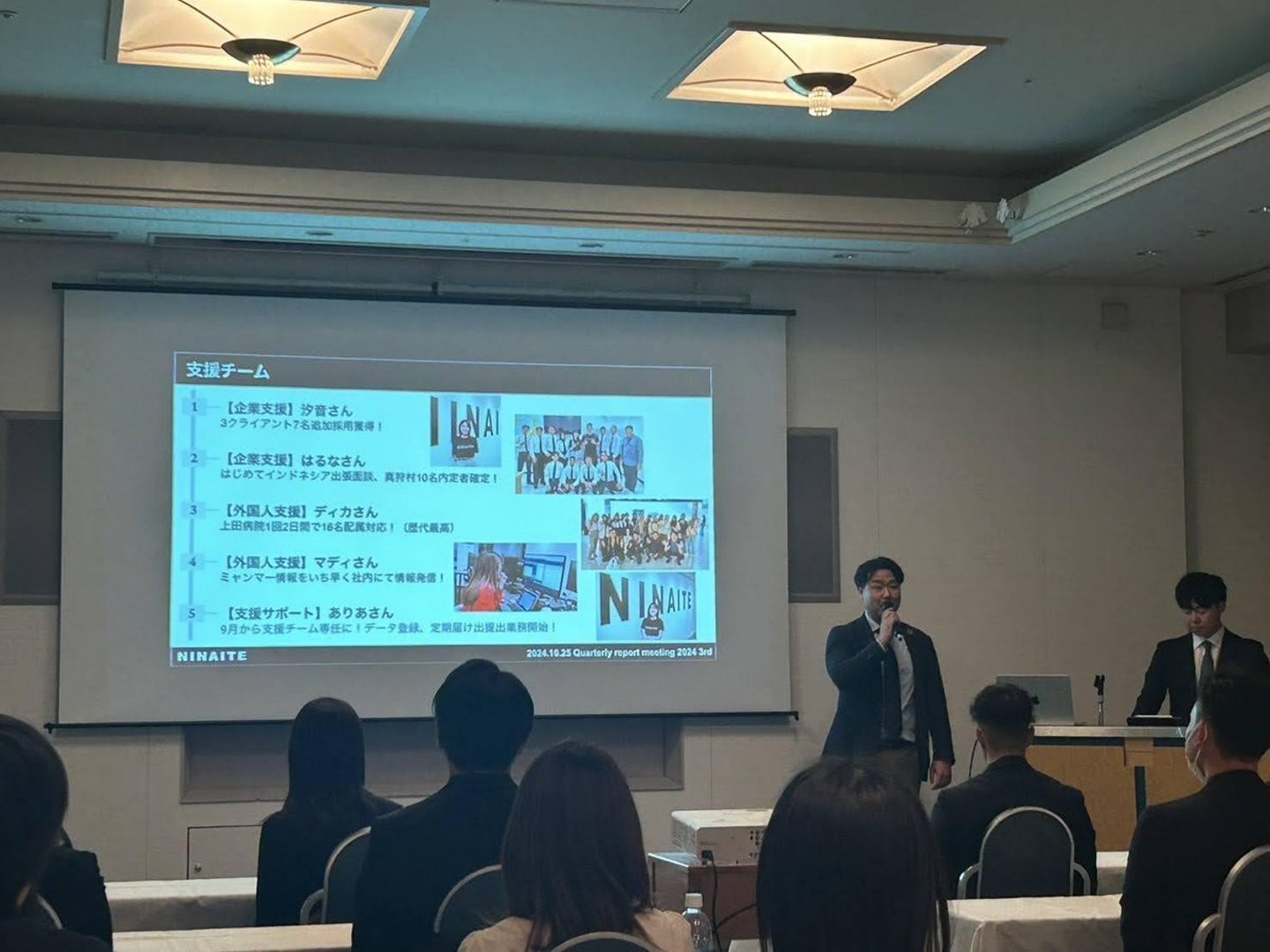 NINAITEの事業の根幹を担い、約600名の外国人さんをサポートする支援チームの報告。最年少メンバーのインドネシア出張で既存のお客様の追加採用10名の面接実施、バックオフィスメンバーのジョインで仕組み化が進んだ事など発表がありました。