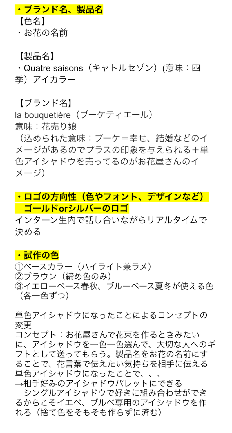 また、ここでのミーティングで私達は新たに製品名と色名についても話し合い、決定させました。製品名は「Quatre saisonsアイカラー」、色名はそれぞれに花の名前をつけました。