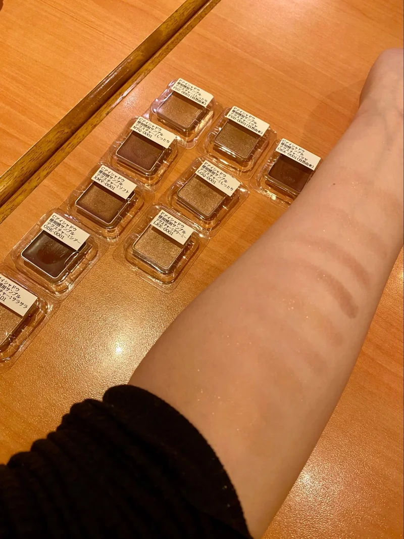ベンチマークとなる市販製品を元に、色・質感などの検討を進めていきます。いろいろなアイシャドウを集めて比較するのは、楽しいながらも難しい作業でした。