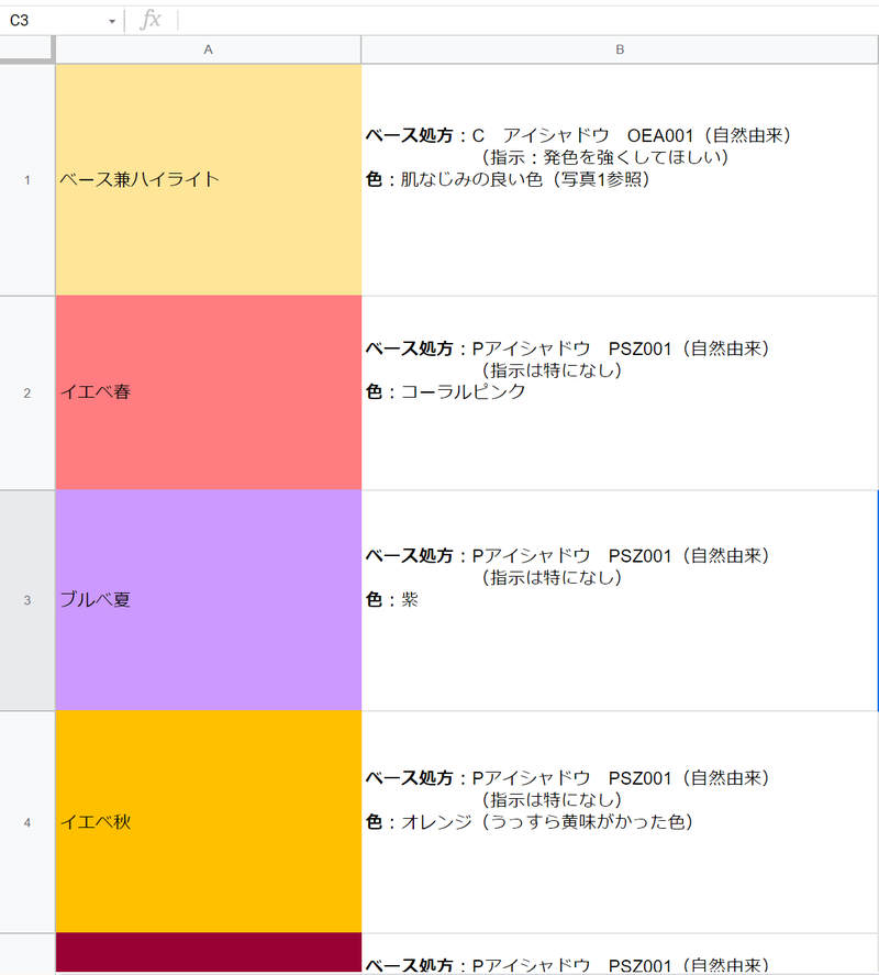 具体例としては、ベース兼ハイライトのベース処方を「C アイシャドウ OEA001(自然由来)」で、それに対する指示が、「発色を強くしてほしい」というような形です。また、肌なじみのいい色にしてほしいので、「クリーム色のような色にしてほしい」というような指示も出しました。