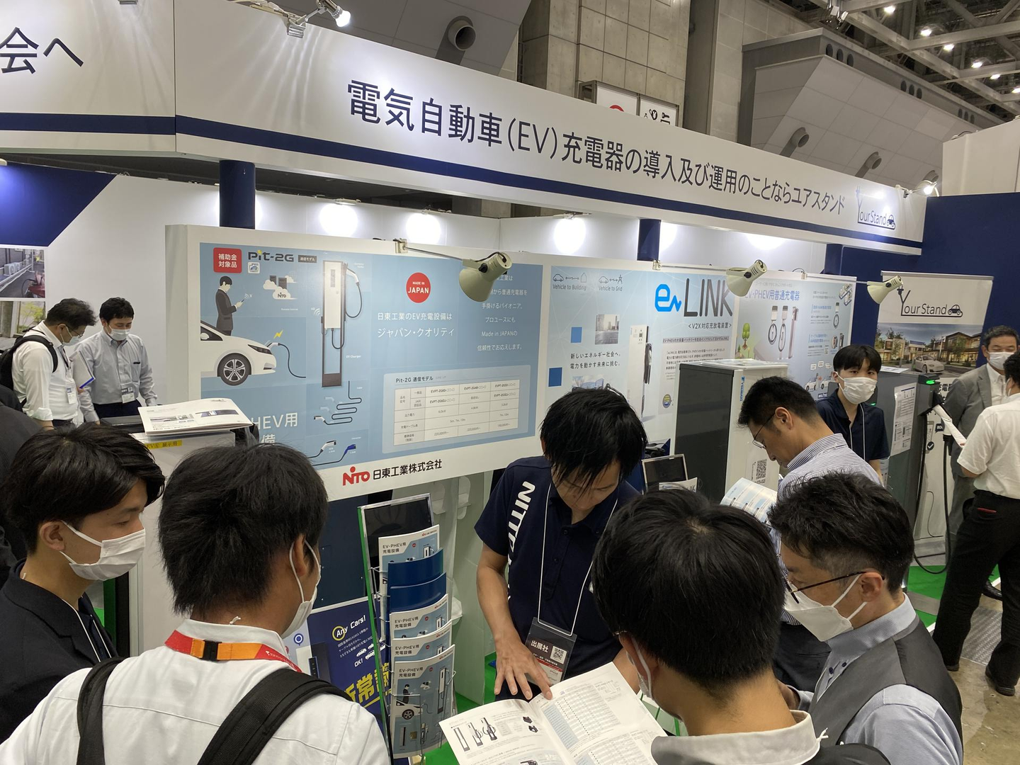 弊社ブースの特徴は、パナソニック、日東工業、モリテックスチール、椿本チエイン、ニッパツパーキングシステムズなど様々なメーカーの最新充電器、充放電器、そして機械式駐車場におけるEV充電がずらりと並んでいること。メーカー様にも協力いただき、ブース内では各社のスタッフの方々も一緒に商品の案内をいただきました。