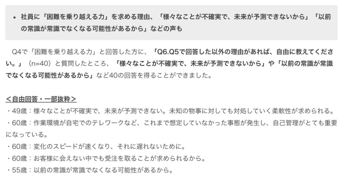 多くの経営者は、この “不確実な未来” が当たり前の現代においては、既存の知識や正解だけでなく、自ら答えを創っていく「困難を乗り越える力」を重要に考えているようです。