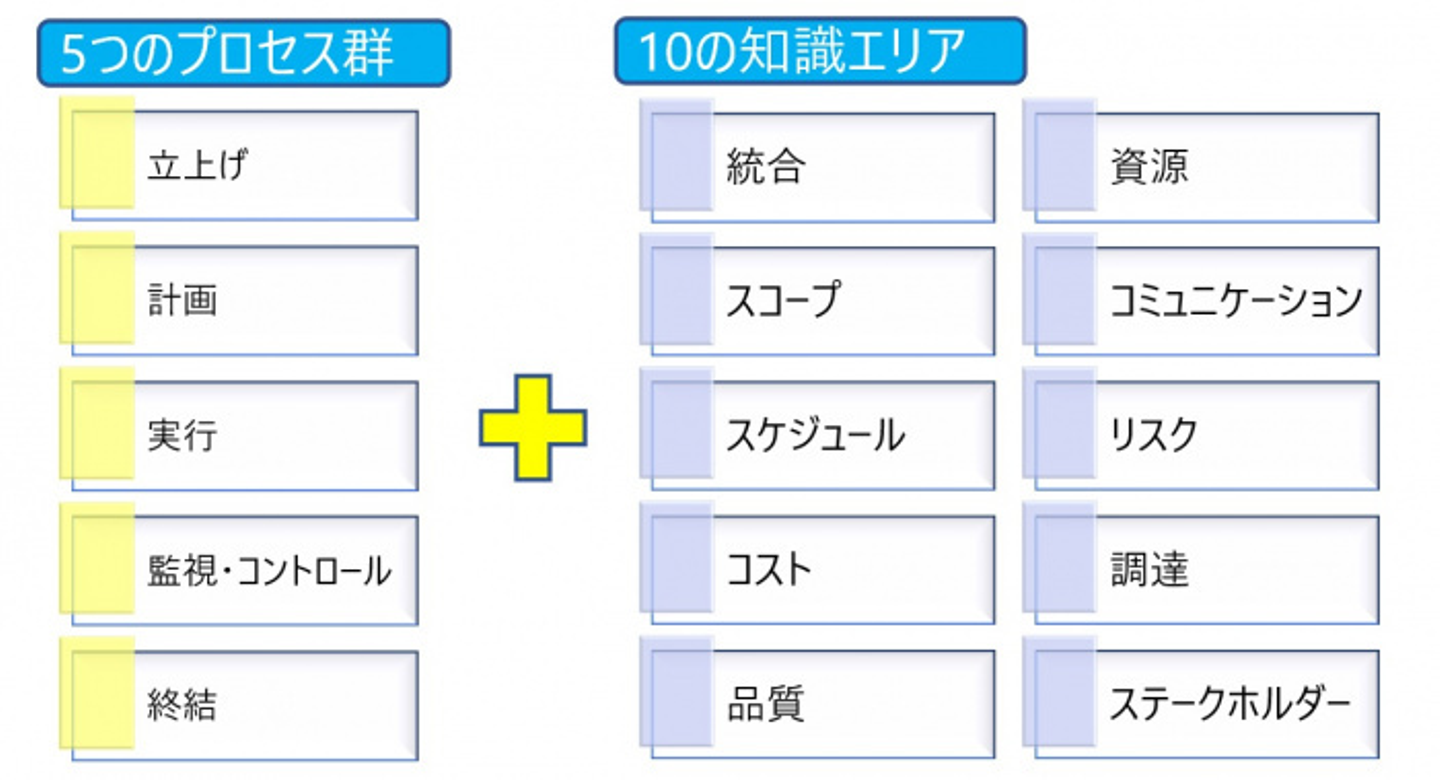 アジャイルでも「立上げ」「計画」「実行」「監視・コントロール」「終結」といったプロセスをイテレーションごとに繰り返しますし、実際にそれらのプロセスを回すためには10の知識エリアに挙げられているような「統合(全体を考える)」「スコープ」「スケージュール」「コスト」「品質」「資源(リソース)」「コミュニケーション」「リスク」「調達」「ステークホルダー」の要素は常に考慮しながら進めていく必要があります。