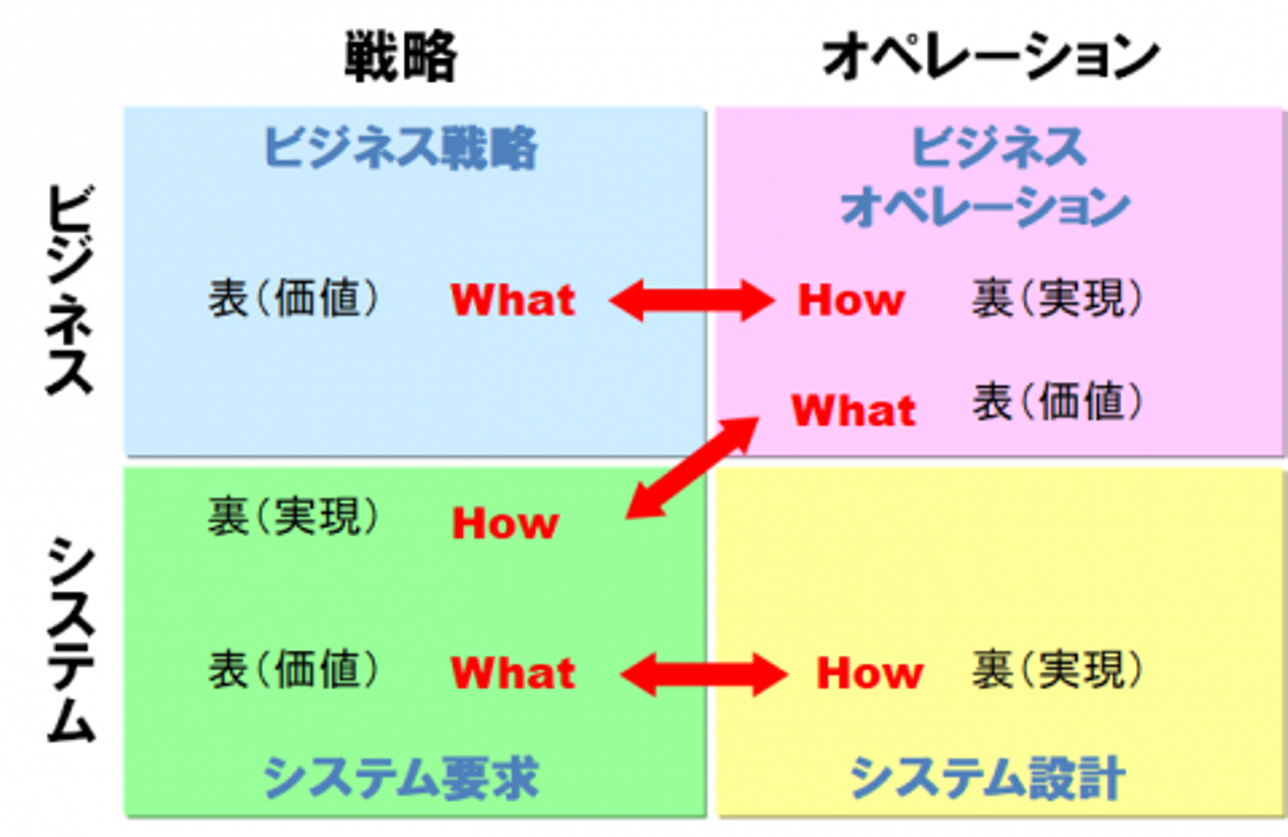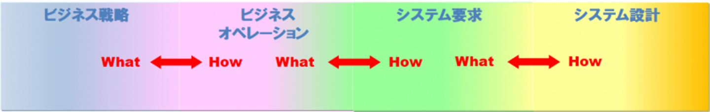 この図は、ビジネス戦略⇒ビジネスオペレーション⇒システム要求⇒システム設計、というつながりで、WhatとHowが連鎖していることを示しています。ある段階のWhatを実現するために次の段階のHowがあり、それがさらに次の段階から見ればWhatになる、というつながりです。ビジネス戦略というとおおげさに聞こえるかもしれませんが、プロダクトオーナーがプロダクトのビジョンを明確化する際、会社のビジネス戦略抜きにはできないはずです。ビジネスオペレーションは、業務フローをイメージしていただけると、わかりやすいでしょう。