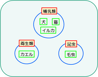 例えば、イヌ、ネコ、イルカ、カエル、毛虫 を分類しようとすると、哺乳類(イヌ、ネコ、イルカ)、両生類(カエル)、昆虫類(毛虫)というようなありきたりの分類か、せいぜい陸生生物(イヌ、ネコ、毛虫)と水生生物(イルカ、カエル)となってしまいます。ここには特に新しい発想はありません。