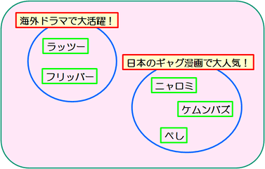 「なんとなく」で良い(ここが大事!)ので、そこに現れているものの本質をよく見極めて行くと、それまでとは違ったもの同士の組み合わせが見えて来ることがあります。たとえば、「海外ドラマで活躍する人気動物(イヌ、イルカ)」と「日本の有名なギャグ漫画に登場する変なやつら(ネコ、カエル、毛虫)」といったように。(本当はこれもちょっと違うんですが)