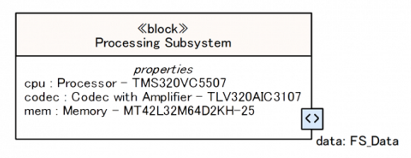 モデリングツールを利用すると、下の図からポート要素を削除すると自動的に上の図の表示に変わり、上の図の表示でポートを要素として表示するようにすると下の図に自動的に変わります。状況や目的に応じて複数の表記形式から選択できる点もSysMLの特徴になりますが、ExcelやPowerPointのような作図ツールではこのような表記の変更が自動で行われることはなく、手作業になります。