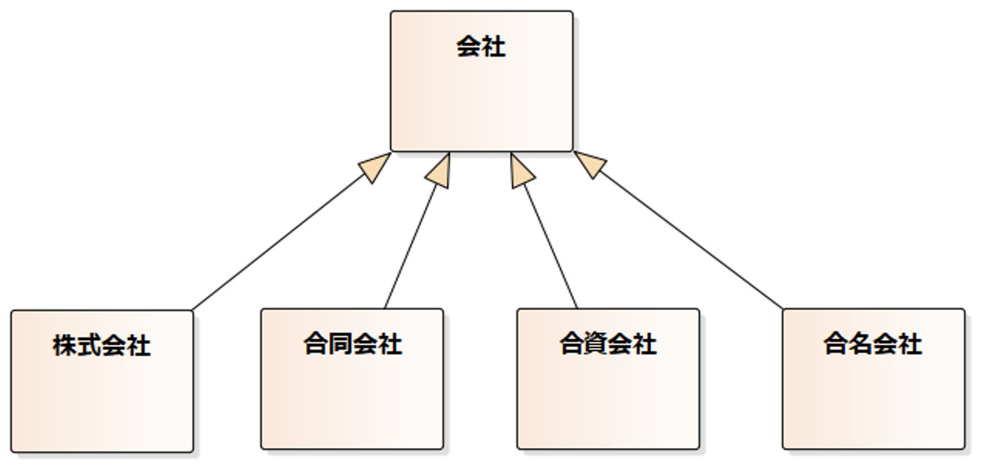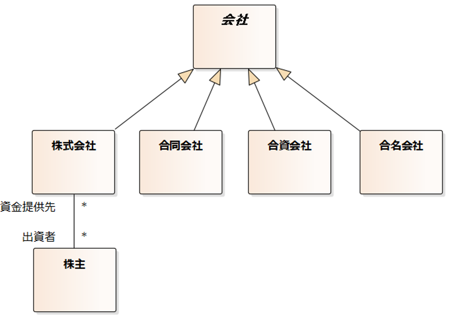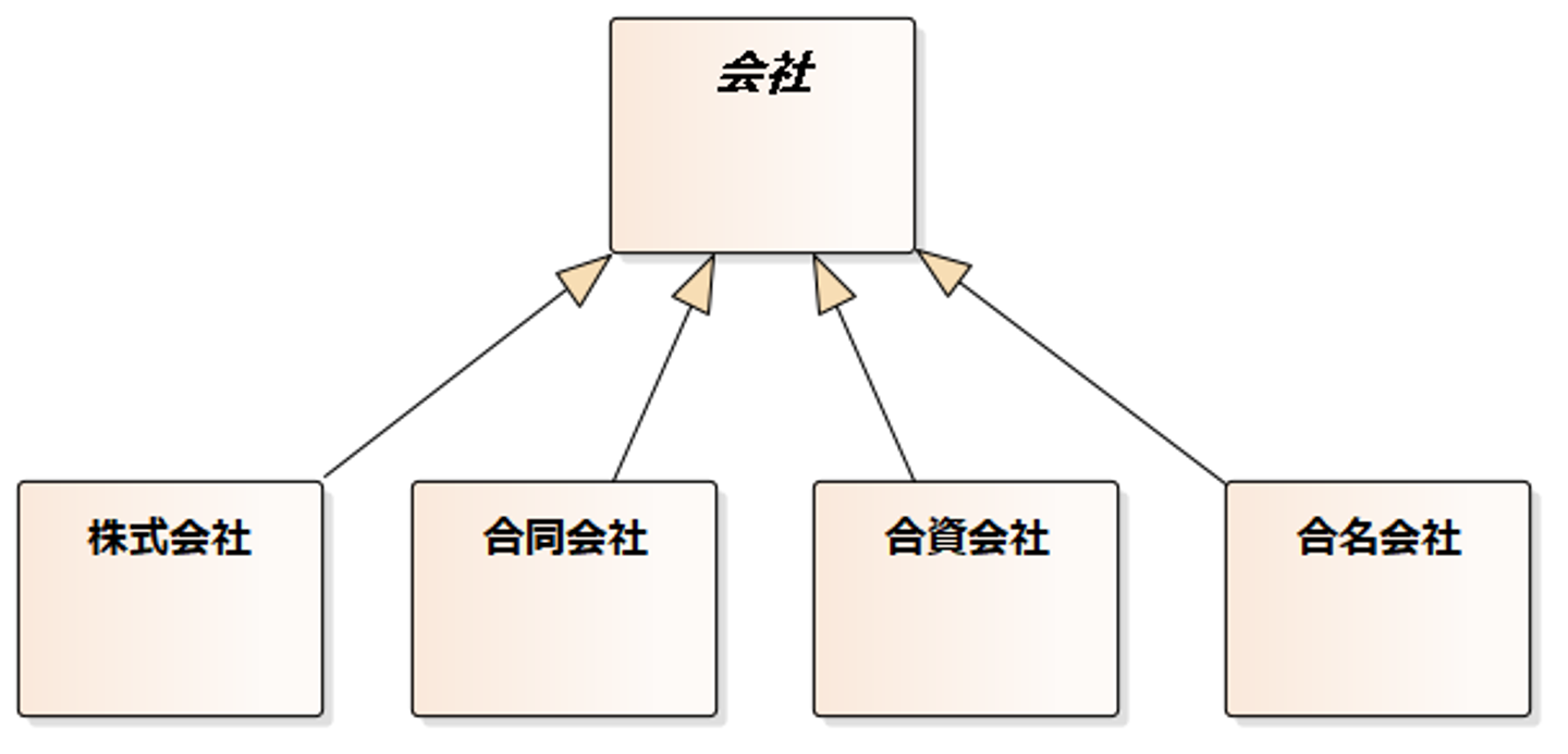 【問題】以下をモデル化してください。<会社の設立>会社には4つの種類があります。株式会社、合同会社、合資会社、合名会社の4つです。
